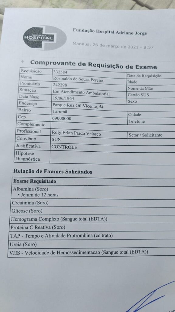 EXAMES | Ainda segundo informações da filha, o paciente precisa apresentar exames solicitados pelo hospital em que o mesmo foi atendido, confira na imagem: