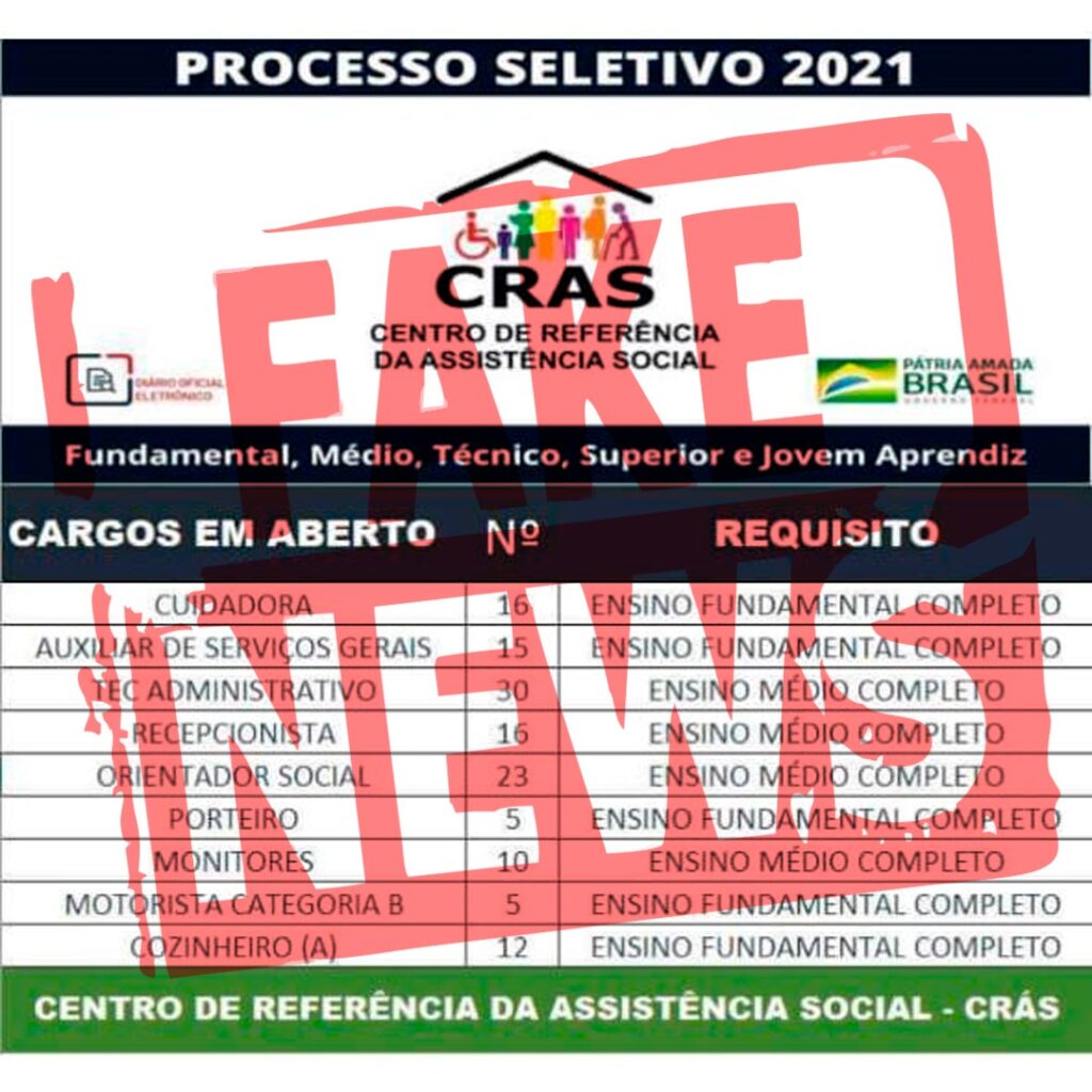 No site para o suposto processo seletivo, é informado vagas para nove áreas nos Centros de Referência da Assistência Social (Cras)