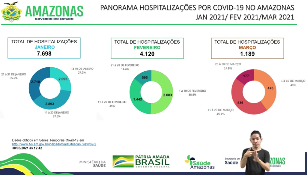 Também segundo os números de hospitalização no Estado, houve grande redução, sendo em Janeiro 7.698, Fevereiro 4.120 e neste mês de Março 1.189 hospitalizações por Covid-19 no Amazonas. Acompanhe na imagem 2.