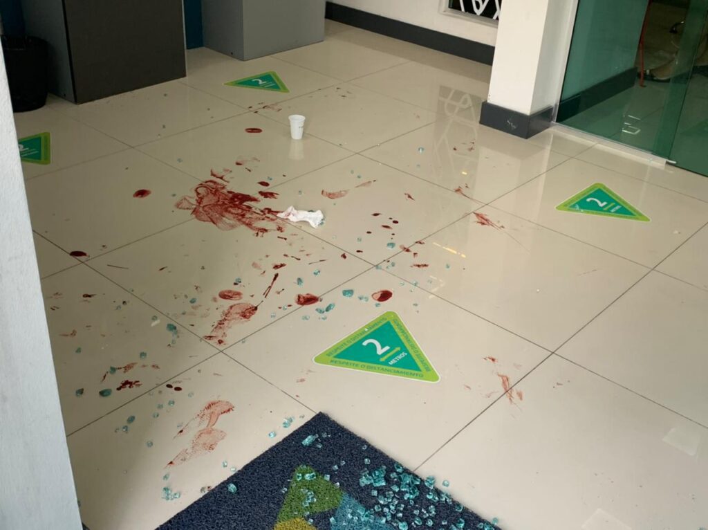 A briga começou em frente à agência, e, nas imagens compartilhadas é possível ver o momento em que o condutor do veículo saca uma arma e atira no chão, a bala chega a ricochetear e atinge a vidraça da agência, a vítima identificada como Hebert Thalita Oliveira, 32, acabou ferido.