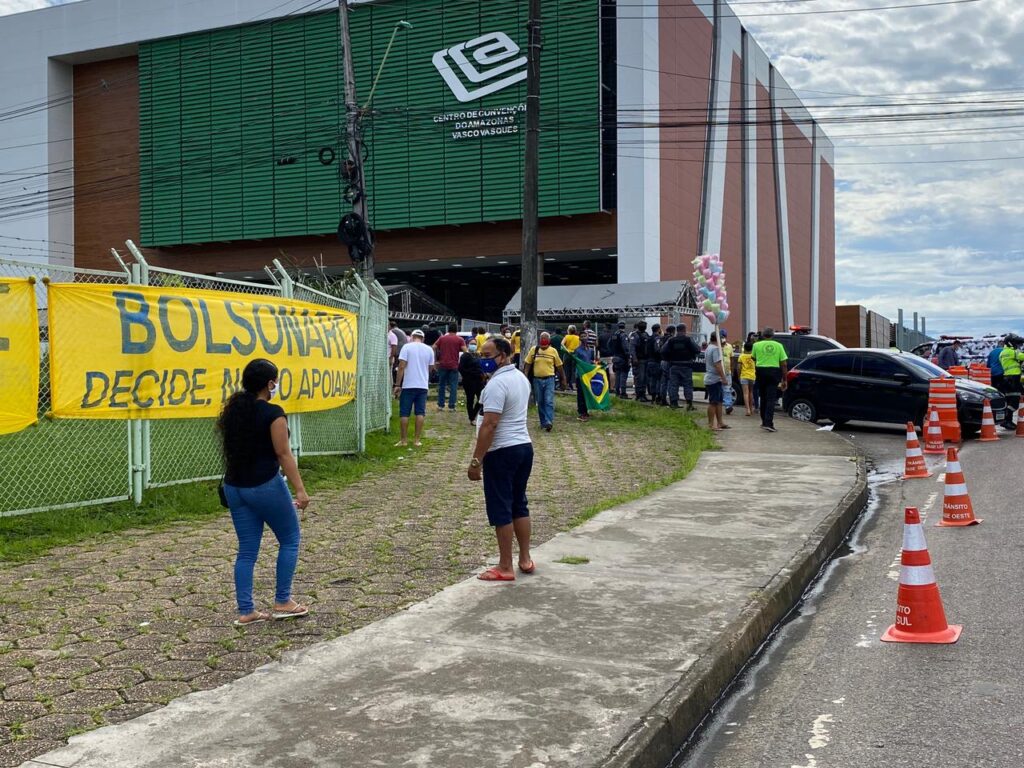 MANAUS-AM| Na manhã desta sexta-feira (23), o presidente Jair Bolsonaro ao chegar em Manaus, foi recepcionado por alguns manifestantes que estavam a sua espera, em frente ao Centro de Convenções Vascos Vasques Zona Centro-Oeste de Manaus. Bolsonaro chegou por volta das 10 horas.