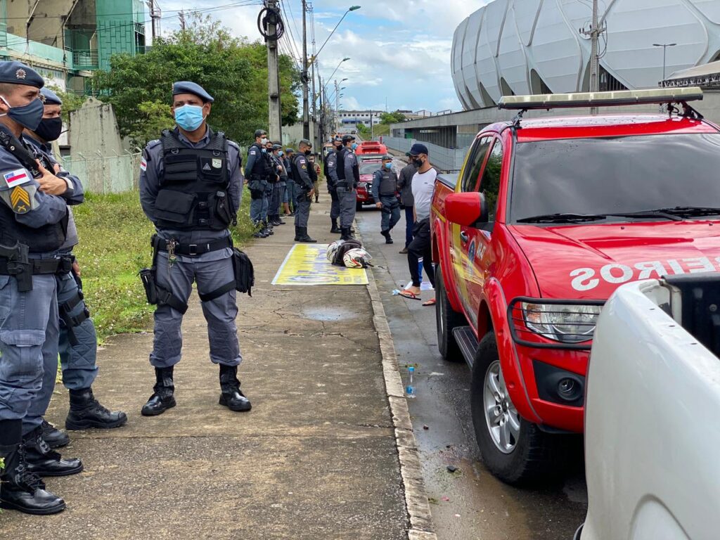 Os pequenos grupos que estavam durante a chegada do presidente carregavam bandeiras do Brasil e cartazes. A segurança no local foi reforçada.