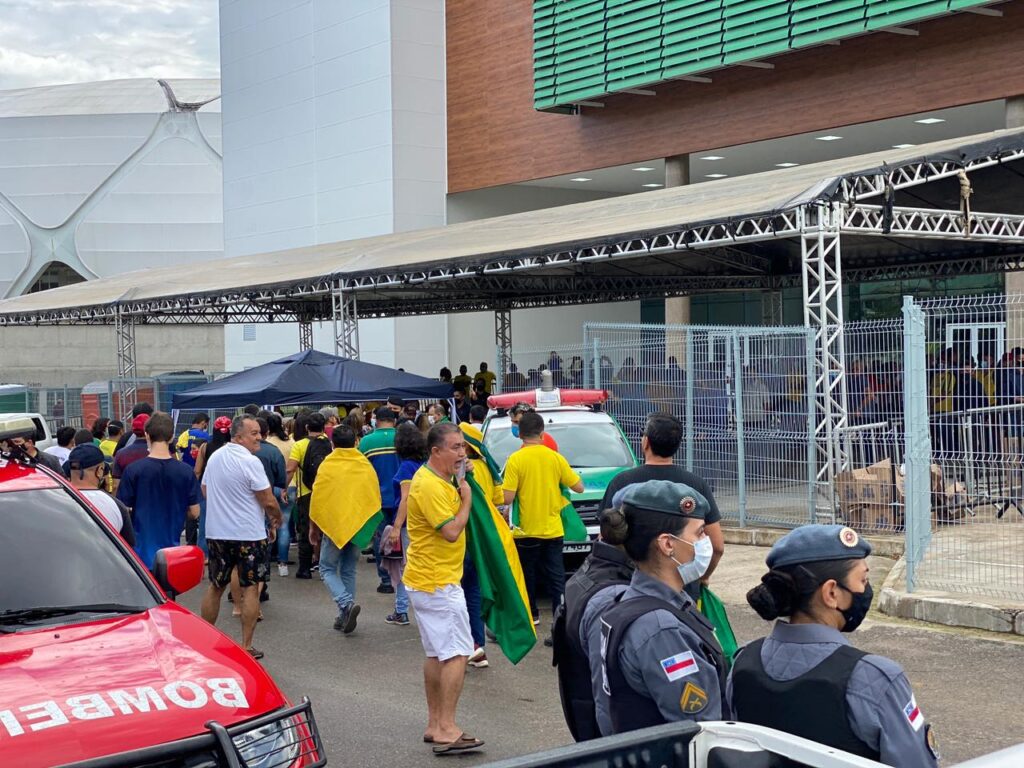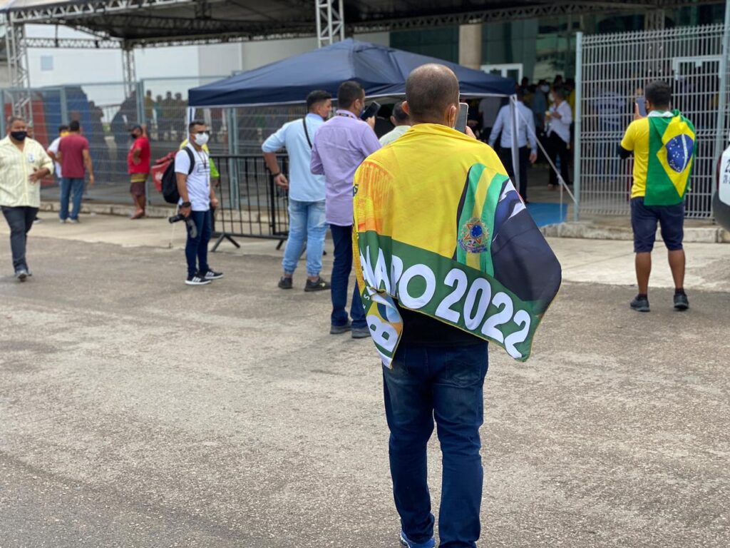 A manifestação a espera do presidente ficou dividida em dois grupos, uns a favor de Bolsonaro, outros contra. No local, não teve uma grande aglomeração, apenas pequenos grupos.