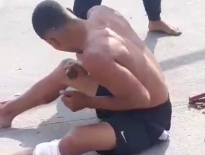 O rapaz aparece nas imagens trajando apenas um short preto, sentado no chão e com um ferimento já enfaixado na panturrilha esquerda.