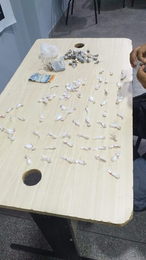 O infrator tentou fugir da revista, mas durante a tentativa de fuga foi imobilizado e detido. Com ele a polícia encontrou dezenas de porções de maconha do tipo skunk e também de oxi. Todo o entorpecente já estava separado para a venda, que acontecia ali mesmo no local.