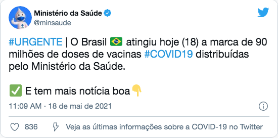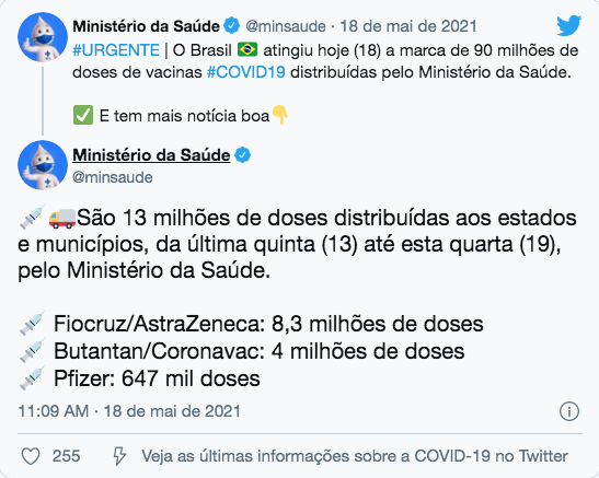 Já o Instituto Butantan informou que um carregamento de matéria-prima para a CoronaVac chegará ao Brasil no próximo dia 26 de maio.