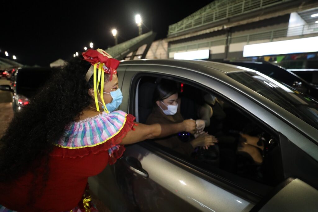 No Sambódromo, quem alegrava as pessoas dentro dos veículos que aguardavam a vez para vacinar eram os atores Elias Monteiro e Neuriza Figueira. Caracterizados com roupas de quadrilha, o casal arrancava sorrisos de quem iria se vacinar pela primeira vez.
