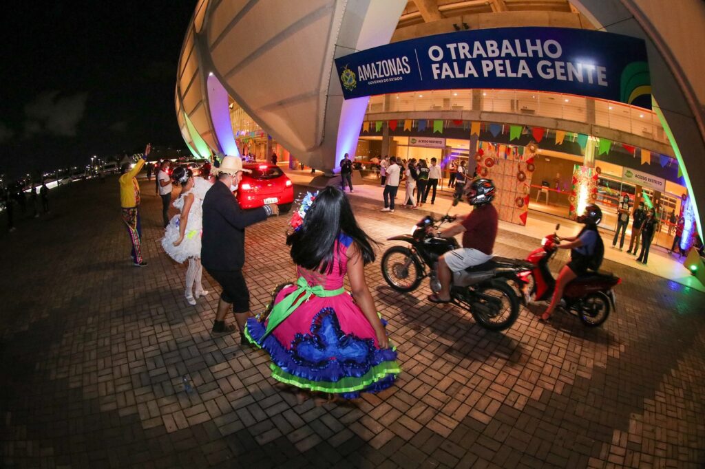 Animação – A animação para o arraial da vacinação também seguiu em clima junino no Sambódromo durante a noite. Decorado com bandeiras coloridas em diversos pontos, o Centro de Convenções recebeu o público de Manaus com música de quadrilha, dança e incentivo para quem ainda não havia se vacinado.