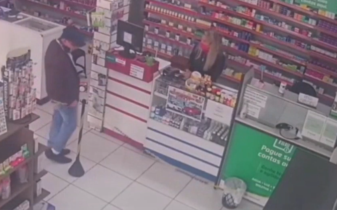 O CRIME| Nas imagens registradas pelas câmeras, mostram o momento em que o homem chega na drogaria e conversa com a vítima no balcão de atendimento. Momentos depois eles se encaminham para o escritório do local onde conversam e entram em uma discussão.