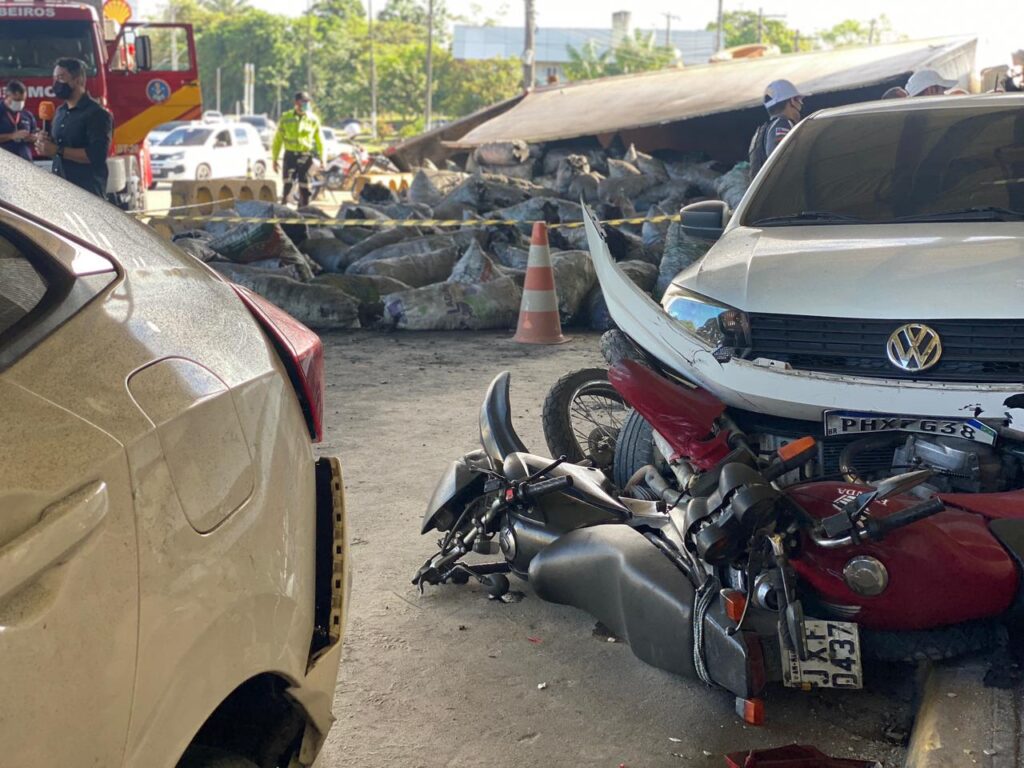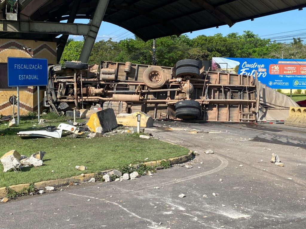 MANAUS-AM| Um homem identificado como Magno Maciel, 47, tombou o caminhão de placa JXT 5139 durante a manhã deste sábado (10), atingindo outros veículos, sendo 2 carros e 2 motos de policiais militares que estavam no plantão, todos estacionados na barreira entre Manaus e outros Municípios, situada no bairro Tarumã , zona Oeste de Manaus