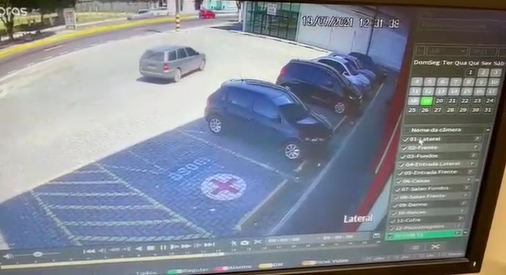 Nas imagens a mulher chega em seu veículo e para no estacionamento da drogaria. Logo em seguida o suspeito em veículo modelo Parati, estaciona próximo ao veículo da vítima. Um homem de camisa vermelha sai do veículo e finge estar verificando o pneu do carro. Ele então aguarda a vítima sair do carro para acionar o dispositivo “Chapolin” que bloqueia o sinal de travamento do veículo.