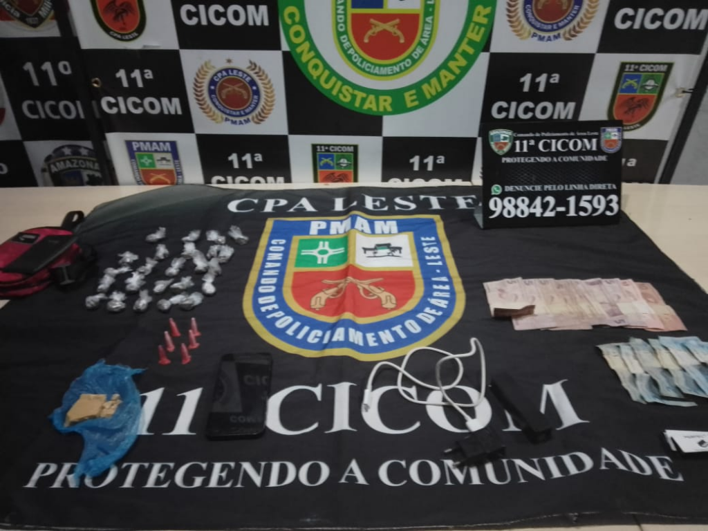 Policiais da 11º Companhia Interativa Comunitária (Cicom), foram acionados por meio de uma denúncia anônima, que informava sobre um suspeito traficando drogas. A guarnição ao apurar as informações constatou a veracidade e encontrou com o suspeito diversas substâncias como, maconha (24 porções), cocaína (cinco pinos), Oxi (uma porção), além de R$72 em espécie, e, um celular.