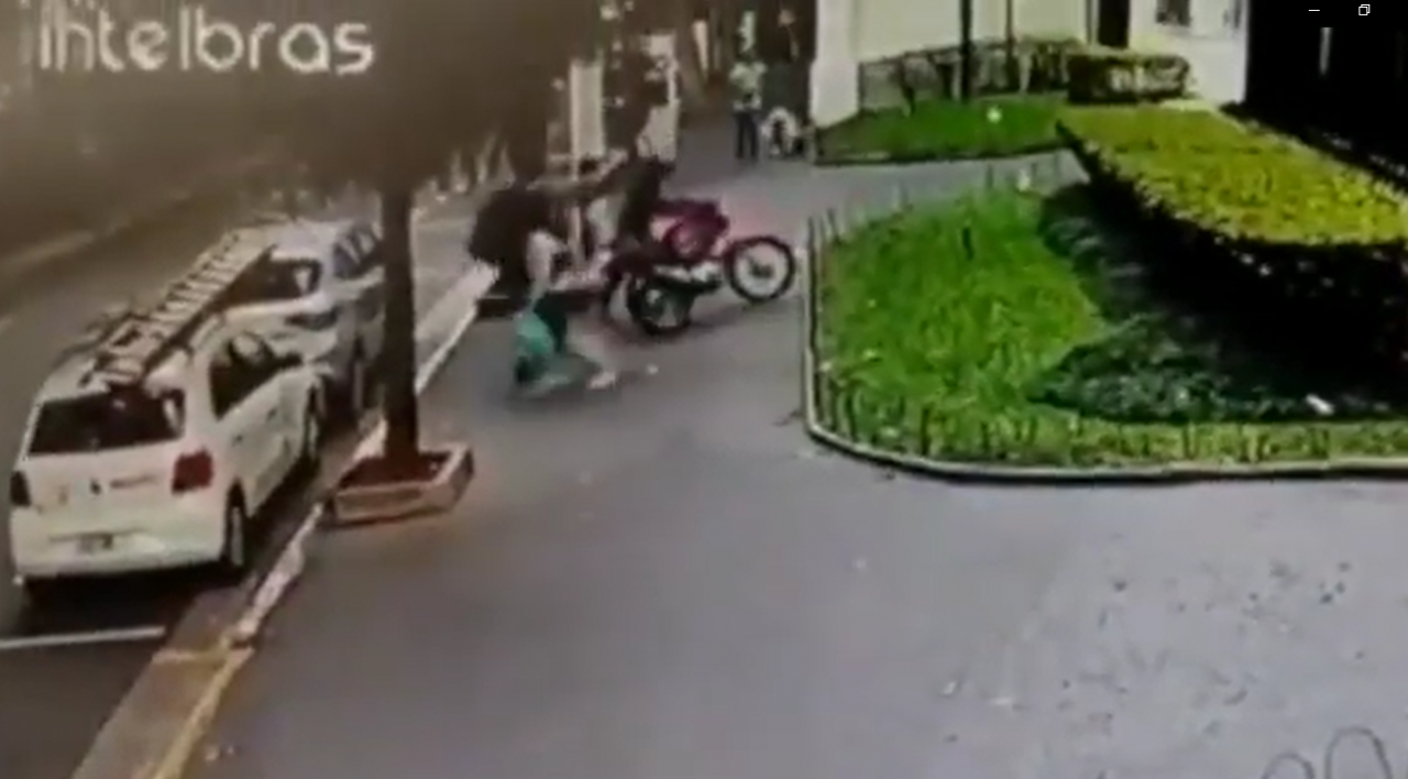 Nas imagens, a mulher aparece caminhando tranquilamente com seu cachorro quando foi surpreendida por dois homens em uma motocicleta. Eles sobem na calçada e tomam a bolsa da vítima, ela reage e acaba tento uma luta corporal com os dois homens.