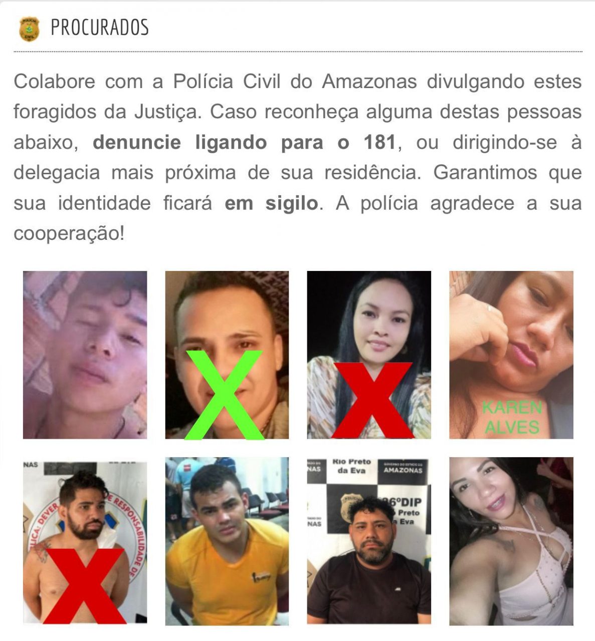 Quem tiver informações sobre o paradeiro dos indivíduos, que denunciem pelo número (92) 99408-4662, o disque-denúncia da 36ª DIP, ou pelo 181, da Secretaria de Estado de Segurança Pública (SSP-AM).