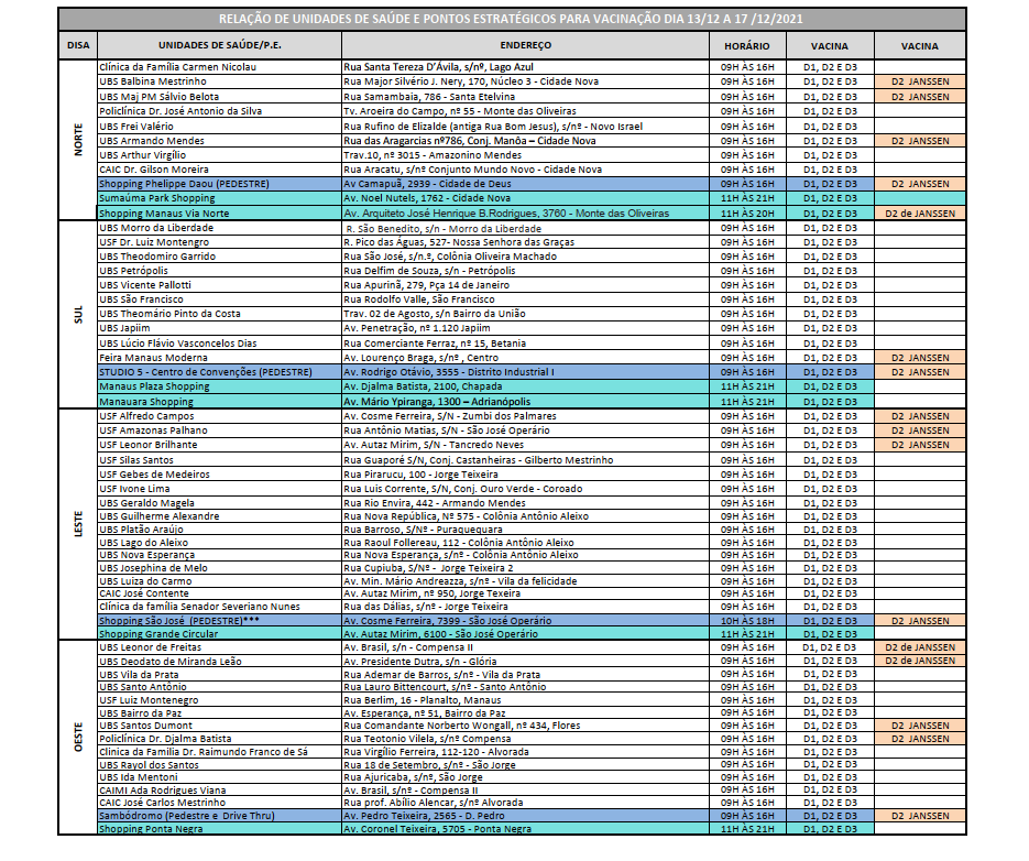 A relação com endereços e horários de funcionamento pode ser consultada no link http://bit.ly/localvacinacovid19 e nas redes sociais da Secretaria Municipal de Saúde (Semsa) @semsamanaus, no Instagram, e Semsa Manaus, no Facebook.
