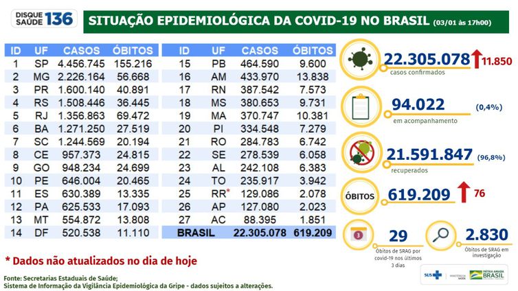 Covid-19: Brasil tem 22,3 milhões de casos e 619,2 mil mortes