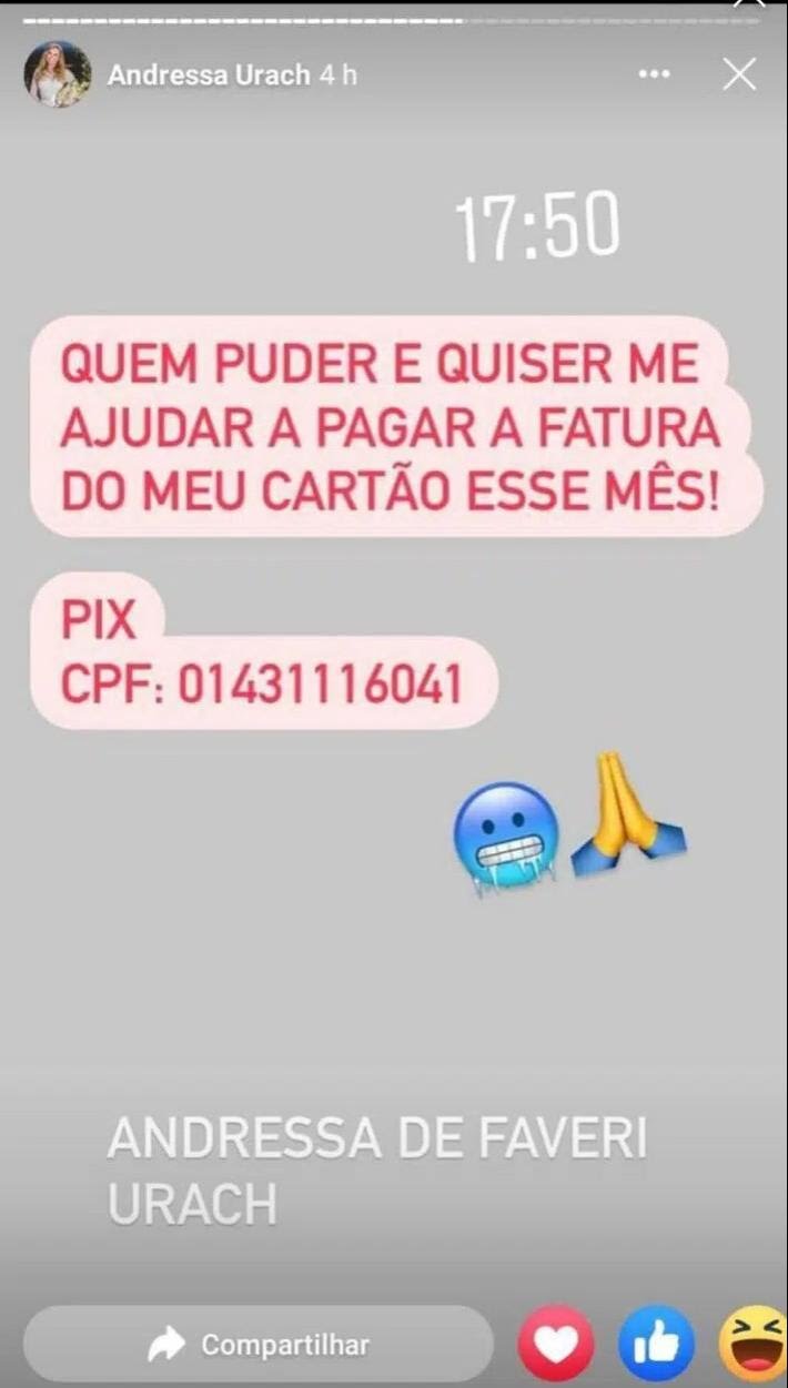 “Quem puder e quiser me ajudar a pagar a fatura do meu cartão esse mês”, escreveu a modelo que colocou também junto com a mensagem a sua chave pix.