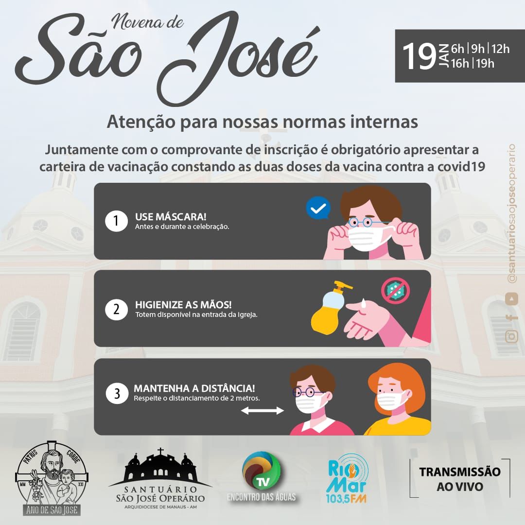 Manaus – AM | O Santuário São José Operário (SSJO), em conformidade ao Decreto do Governo do Estado do Amazonas, que limita a presença do público máximo em eventos em até 200 pessoas, informa que a participação de modo presencial, na Novena de São José, deste mês, 19/01, ocorrerá somente mediante inscrição e apresentação da carteira de vacinação com, no mínimo, duas doses ou dose única. As inscrições iniciaram nesta quarta-feira, 12/01, e seguem até a próxima terça-feira, dia 18/01.