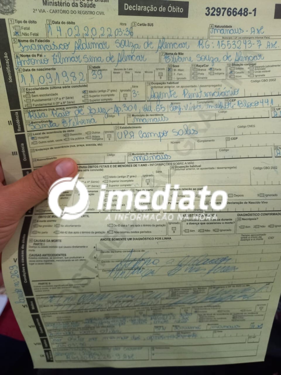 A advogada, Luciana Seixas, procurou a reportagem do Imediato e enviou documentos do laudo e informou que o velório está acontecendo na avenida Getúlio Vargas, depois do Sheik, na Funerária Viana.