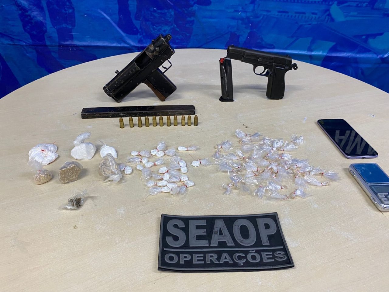 Após chegarem no local, os policias constataram que além das drogas, os criminosos possuíam armas como pistola e submetralhadora na residência.
