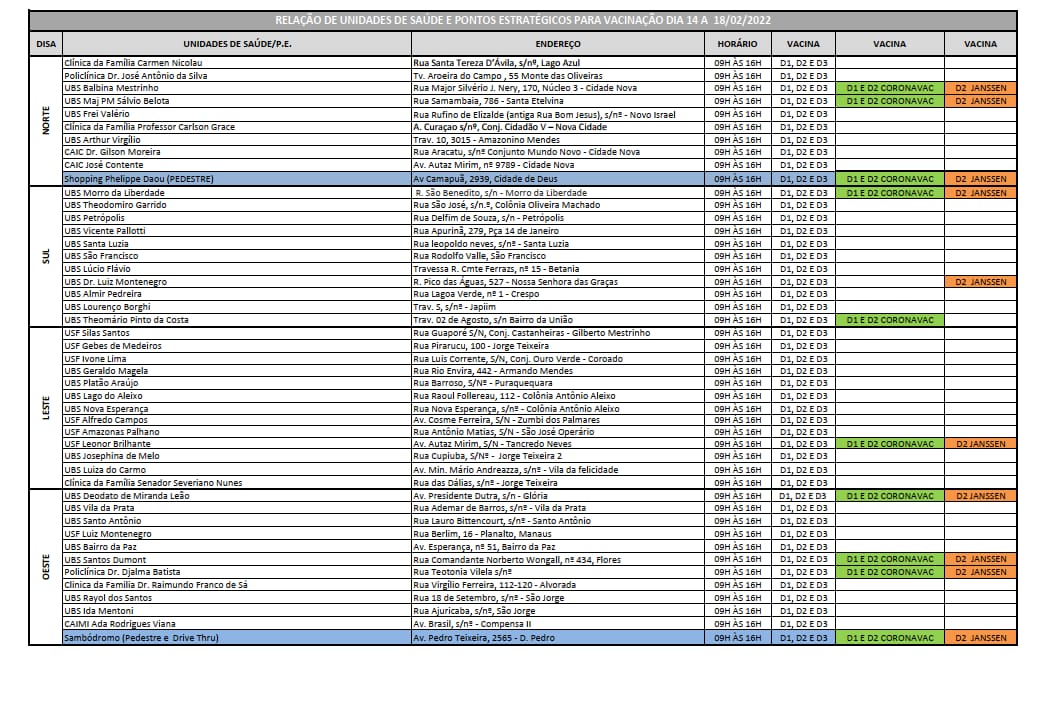 PAÍS | Manaus terá 51 pontos de vacinação contra a Covid nesta sexta-feira, 17, sendo 46 para atendimento ao público a partir de 12 anos ou mais , com primeira, segunda, terceira e quarta doses, e 5 para receber exclusivamente às crianças de 5 a 11 anos, com as vacinas Pfizer pediátrica e CoronaVac.