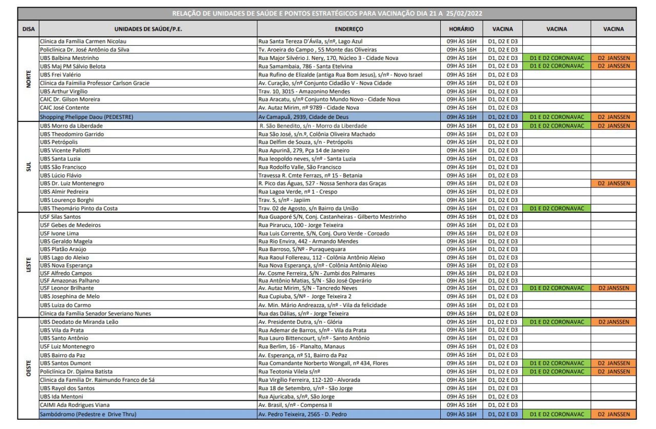 PAÍS | Em combate a Covid-19, Manaus terá 51 pontos de vacinação contra a Covid nesta sexta-feira, 25, sendo 46 para atendimento ao público a partir de 12 anos ou mais, com primeira, segunda, terceira e quarta doses, e 5 para receber exclusivamente às crianças de 5 a 11 anos, com as vacinas Pfizer pediátrica e CoronaVac.