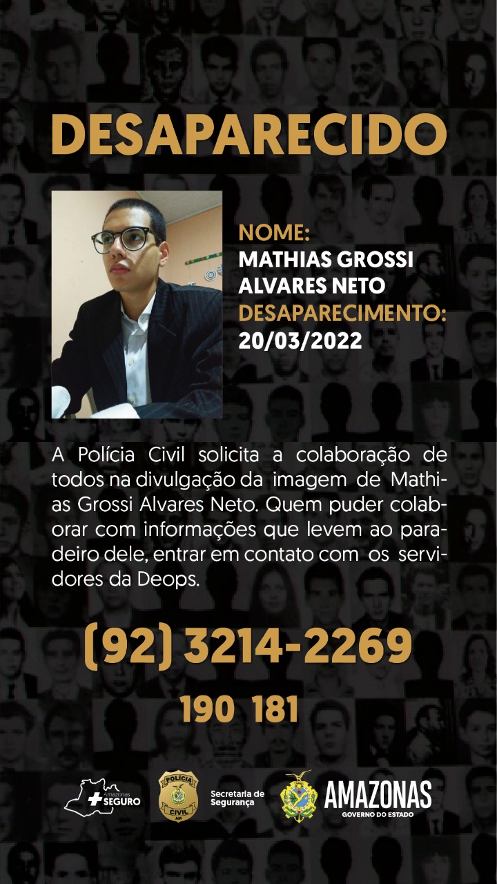 A delegada Catarina Torres, titular da Deops, solicita a quem tiver informações sobre a localização de Mathias que entre em contato com a Deops, por meio do número (92) 3214-2269, ou pelo 181, o disque-denúncia da Secretaria de Estado de Segurança Pública (SSP-AM).