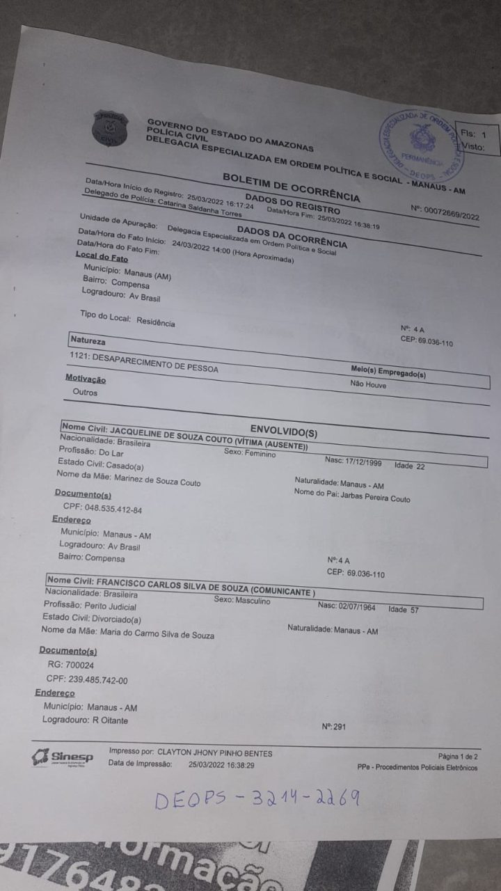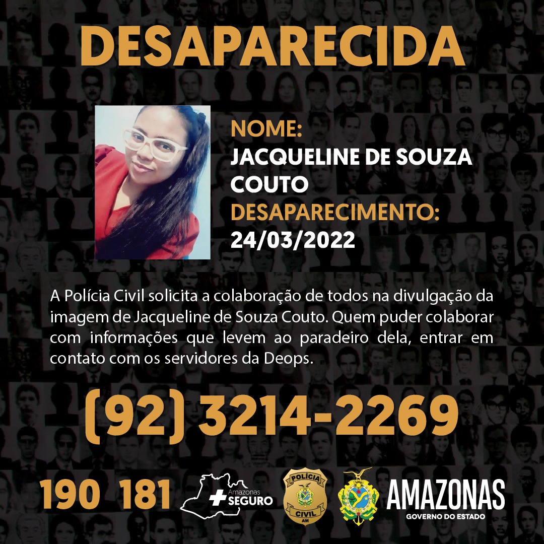 A delegada Catarina Torres, titular da Deops, solicita a quem tiver informações sobre a localização de Jacqueline, que entre em contato com a Deops, por meio do número (92) 3214-2269, ou pelo 181, o disque-denúncia da Secretaria de Estado de Segurança Pública (SSP-AM).