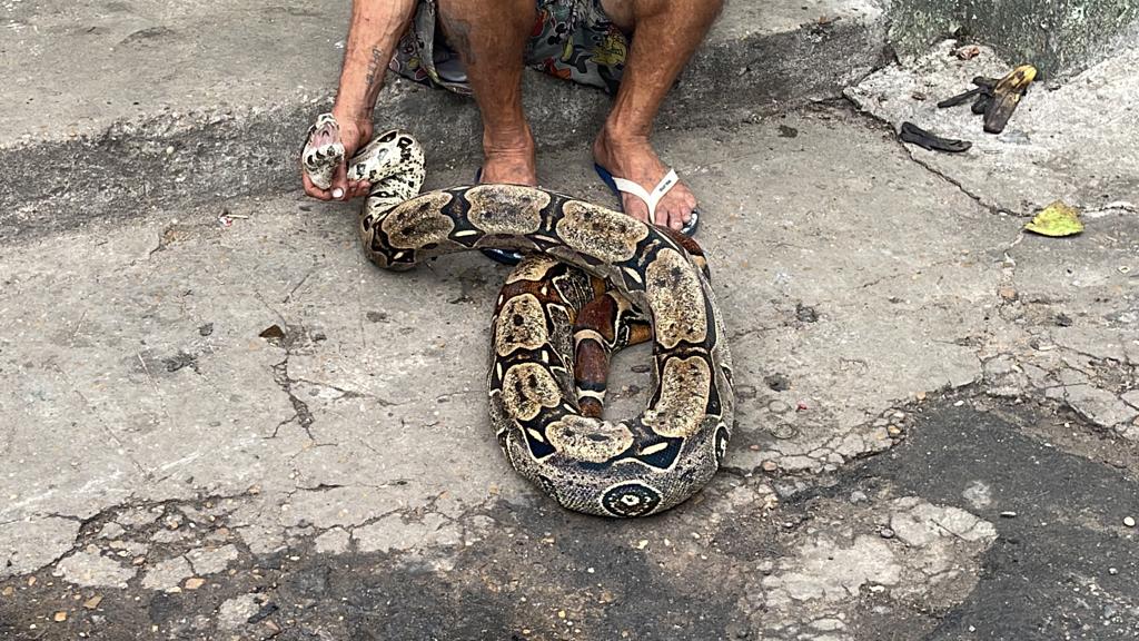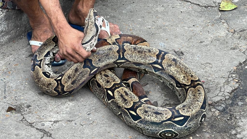 Policias já acionaram o Batalhão Ambiental para fazer a retirada da jibóia do local.