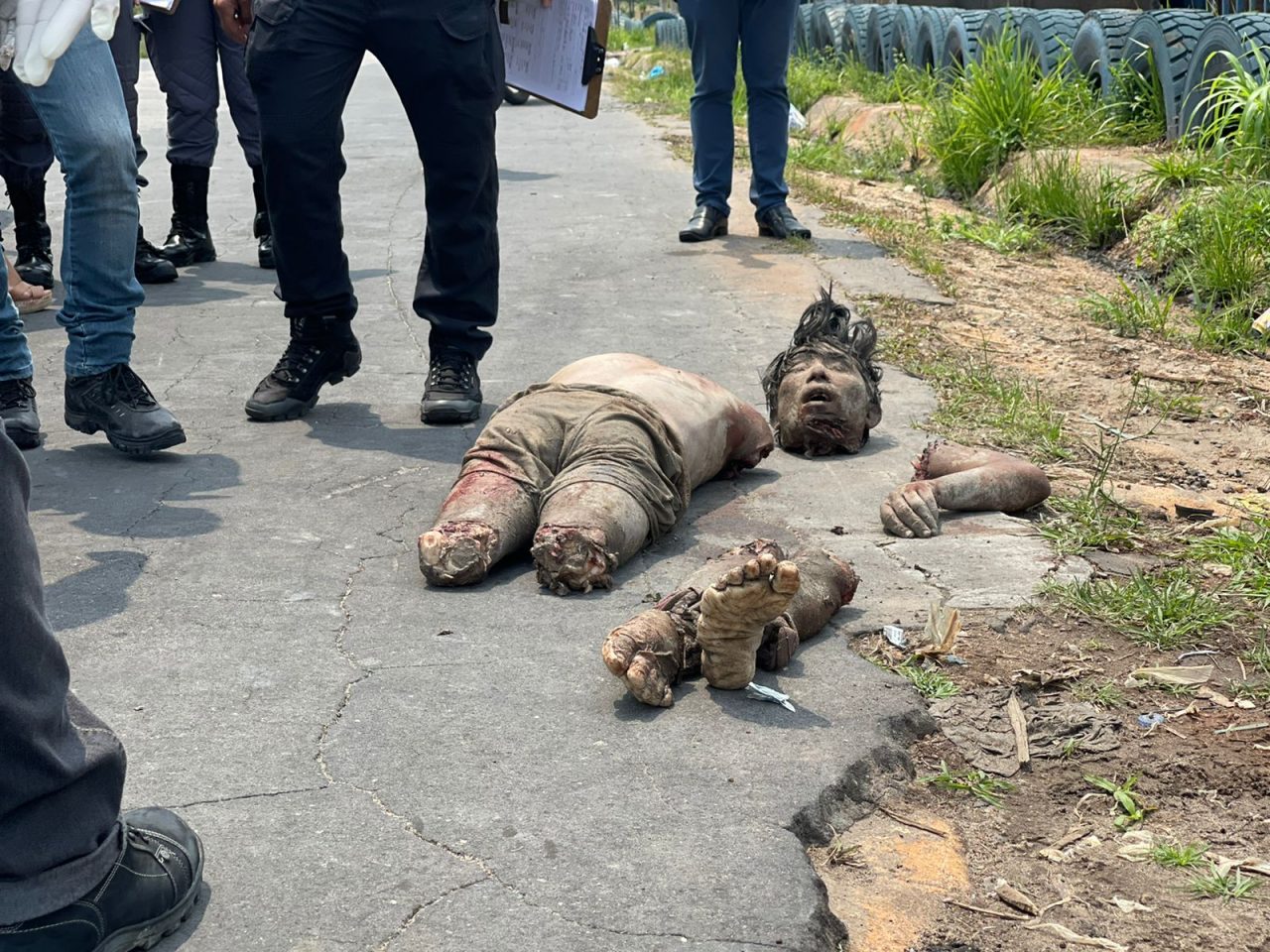 Segundo informações preliminares da perícia, o homem possui sinais que indicam que ele foi agredido antes de ser esquartejado. Os pés do rapaz estavam amarrados com pedaços de um tecido vermelho.