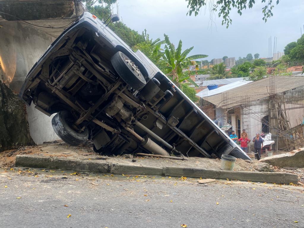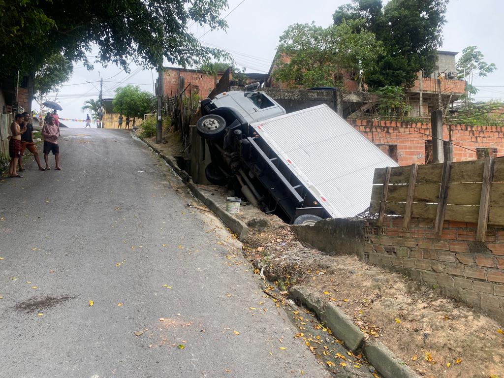 Manaus – AM | Um caminhão perdeu o freio e tombou em ladeira em frente a residente na rua Londres, bairro Gilberto Mestrinho, zona Leste de Manaus.
