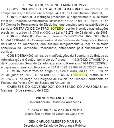 Manaus – AM | O delegado Gustavo de Castro Sotero, condenado pela morte do advogado Wilson Justo Filho, em uma casa noturna em 2017, foi demitido do cargo público que ocupava. A decisão foi divulgada pelo Diário Oficial do Amazonas e assinada pelo governador Wilson Lima, na última quinta-feira (15).
