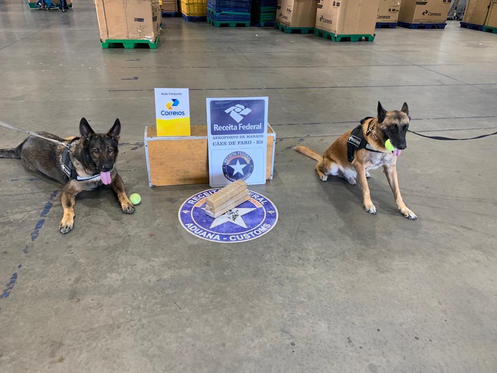 Após realizar procedimentos de análise de risco aduaneiro, servidores da Receita Federal identificaram encomendas com suspeitas de presença de drogas. Por conta dos indícios, a Equipe K9 da Receita Federal foi acionada e com a atuação dos agentes caninos Odin e Deco. A suspeita da fiscalização foi confirmada.