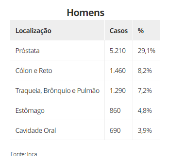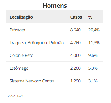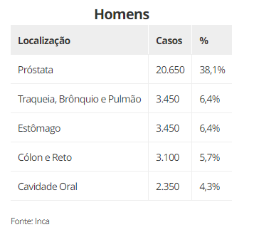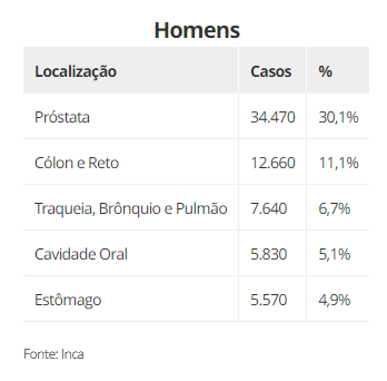 Nos homens, um total de 72 mil novos casos de câncer de próstata são esperados a cada ano para o próximo triênio, perdendo apenas para o câncer de pele não melanoma, em todas as regiões do país.