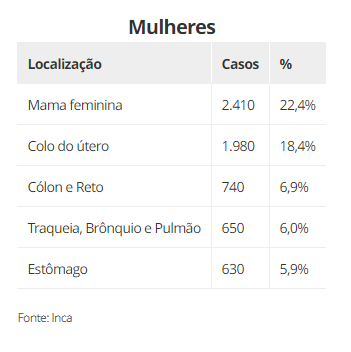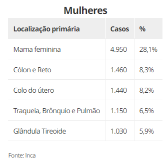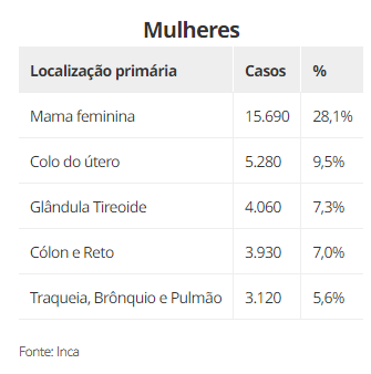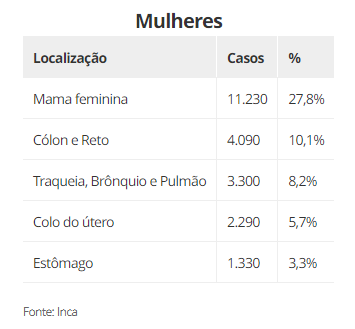 Depois do pele não melanoma, os tumores malignos mais incidentes no país são os seguintes: