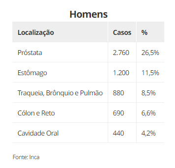 Já no Norte e Nordeste assim como no Centro-Oeste, o câncer de próstata é o mais incidente, seguido do câncer de mama feminina. Em terceiro lugar, fica o câncer do colo do útero no Norte e Nordeste e, no Centro-Oeste, o câncer colorretal.