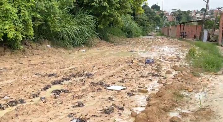Uma rua do bairro foi completamente tomada pela lama, impedindo assim que a população consiga andar pelo local. O barro também chegou a invadir uma residência.