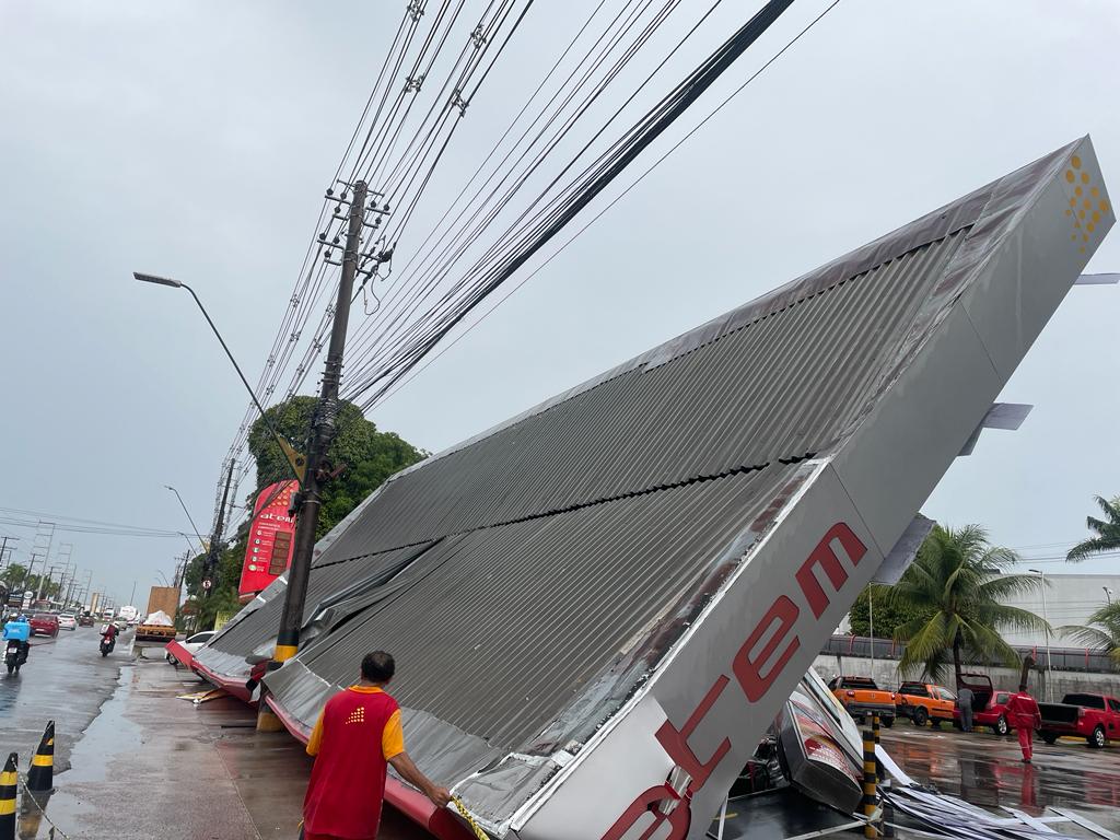 Estrutura de posto de combustíveis desaba durante chuva forte em Manaus; vídeo mostra frentistas correndo.