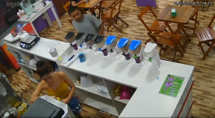 Por volta de 20h20, dois homens em uma motocicleta chegam em uma loja de açaí. Em seguida, um dos suspeitos entra e se passa por cliente. Momentos depois, é possível ver o mesmo sacando a arma da cintura e anunciando o assalto, levando a renda do local e os pertences das funcionárias.