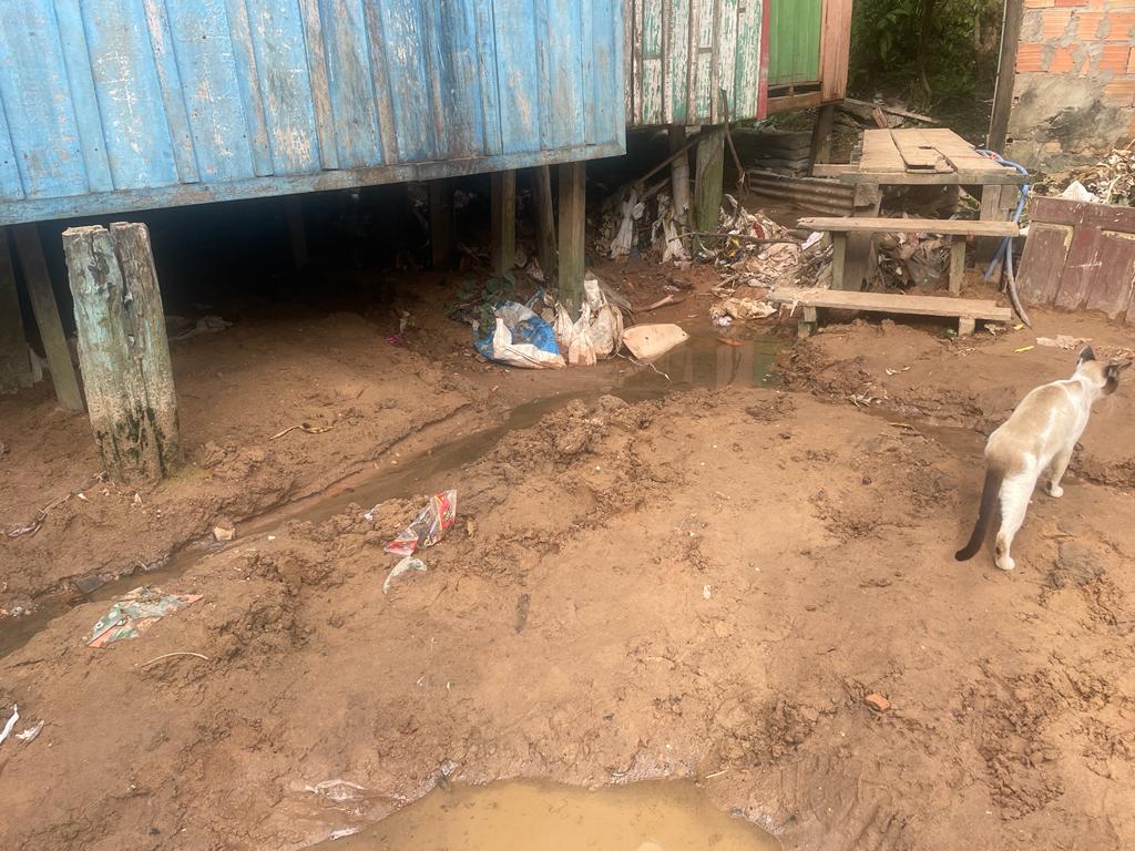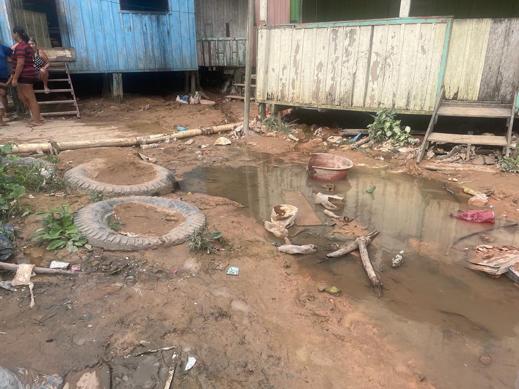 Moradores sofrem com falta de infraestrutura e saneamento básico no Beco Barcelos, em Manaus, agravada em dias de chuva.