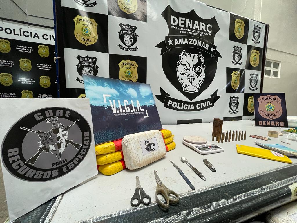 Além das drogas foram apreendidas munições, balança de precisão e uma máquina de prensa.