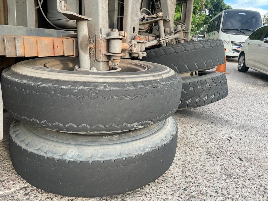 Carreta com trigo tomba na Bola da Suframa e pneus carecas ficam à mostra
