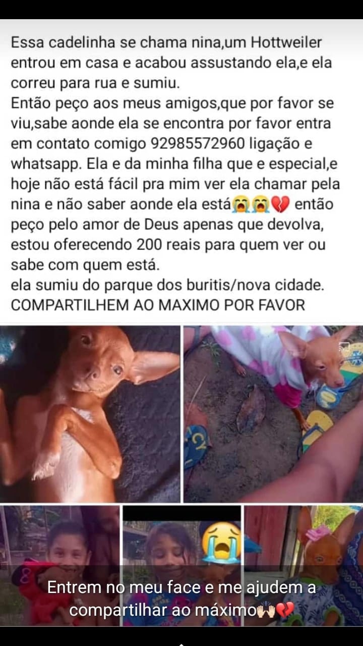 Quem tiver informações sobre a Nina deve entrar em contato com os familiares através do número (92) 98557-2960. Uma recompensa no valor de 200 reais é oferecido para quem encontrar a cachorrinha.