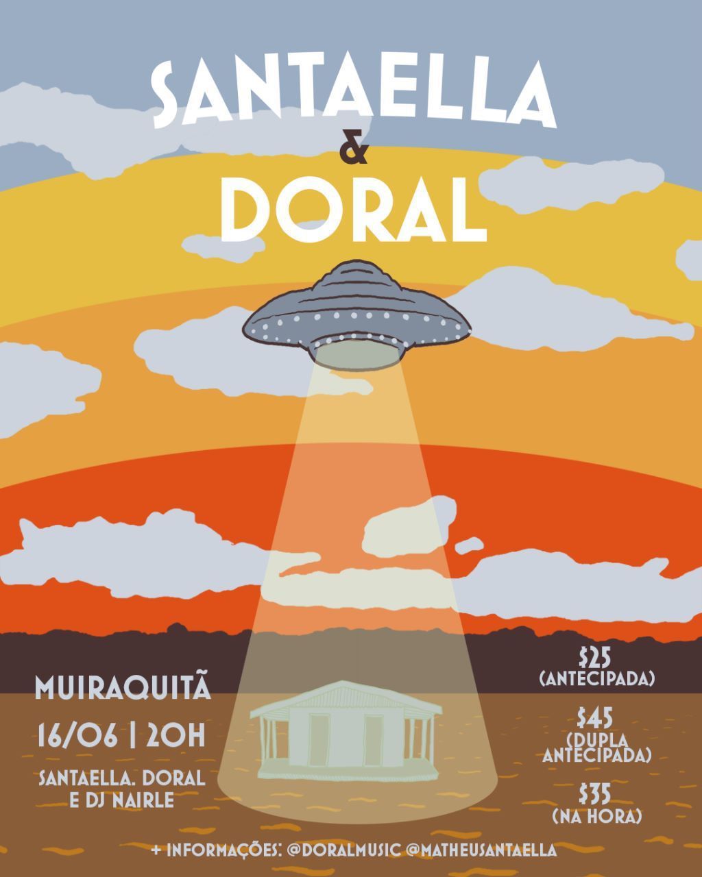 Os ingressos, limitados, estão sendo vendidos ao preço de R$ 25,00 (individual antecipado) e R$ 45 (duplinha antecipado) e podem ser adquiridos pelo site Shotgun (https://shotgun.live/pt-br/events/santaella-doral) ou por pix adonsouzis@gmail.com – Banco Inter (enviar comprovante para: 92 984316426).