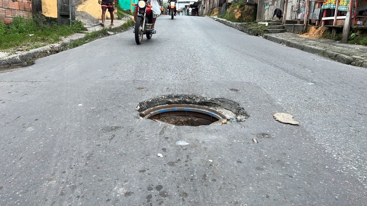 Moradores reclamam de perigo causado por bueiro aberto em via principal na zona Leste de Manaus.