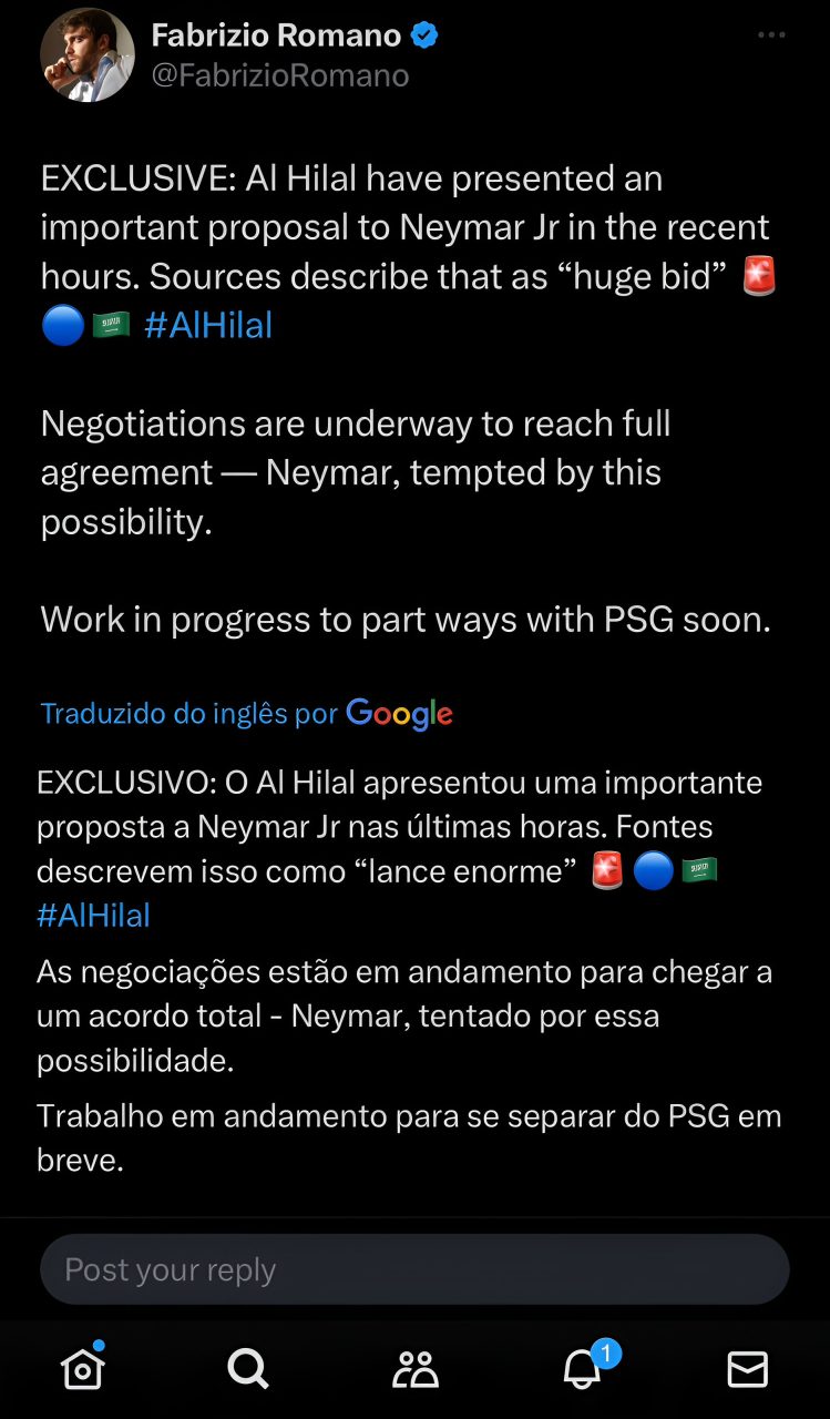 Entretanto, parece que houve uma grande reviravolta. Neste sábado, o jornalista Fabrizio Romano, especialista na área de transferências, informou que o Al-Hilal, da Arábia Saudita, se aproximou do brasileiro.