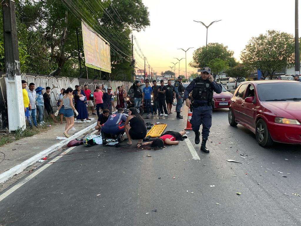 Um motociclista de aplicativo identificado como Leonardo Oliveira, 29 anos, ficou gravemente ferido e uma mulher identificada como Darlene Santos, de 38 anos, morreu na hora após um veículo Fiat Cronos de cor branca guiado por um homem identificado como Sebastião Perreira, de 56 anos, invadir a contramão e atingir a motocicleta que estavam no final da tarde deste domingo (3), na Av. Max Teixeira, zona Norte de Manaus.