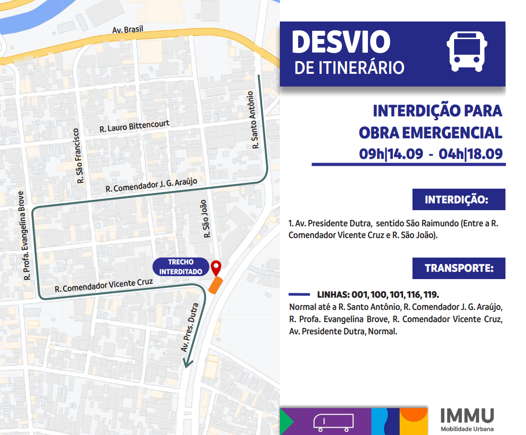 Essa intervenção terá impacto nas rotas de transporte público, com alterações em cinco linhas de ônibus: 001, 100, 101, 116 e 119. Os passageiros devem estar atentos às mudanças. As rotas dessas linhas seguirão normalmente até a Rua Santo Antônio, a partir da qual seguirão pelas ruas Comendador J.G. Araújo, Professora Evangelina Brove e Comendador Vicente Cruz, antes de retomar o curso normal pela Avenida Presidente Dutra.