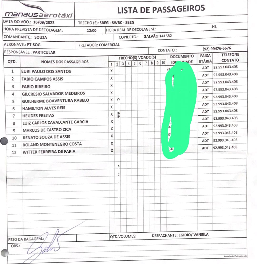 Uma lista repassada pela Defesa Civil mostra o nome das de 12 das 14 pessoas envolvidas no terrível acidente aéreo que ocorreu no município de Barcelos, na tarde deste sábado (16).