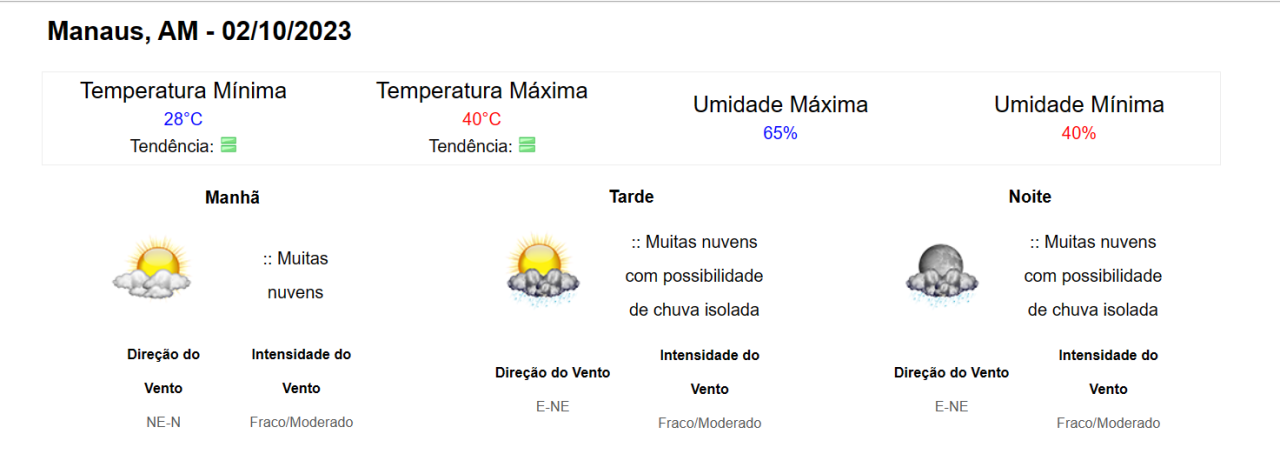 Segundo a previsão do tempo para esta segunda-feira (2), além da máxima ser de 40ºC, o que ajuda nas dezenas de focos de incêndios registrados todos os dias em Manaus, existe possibilidade de chuvas isoladas e isso não proporciona um alívio real para a cidade.